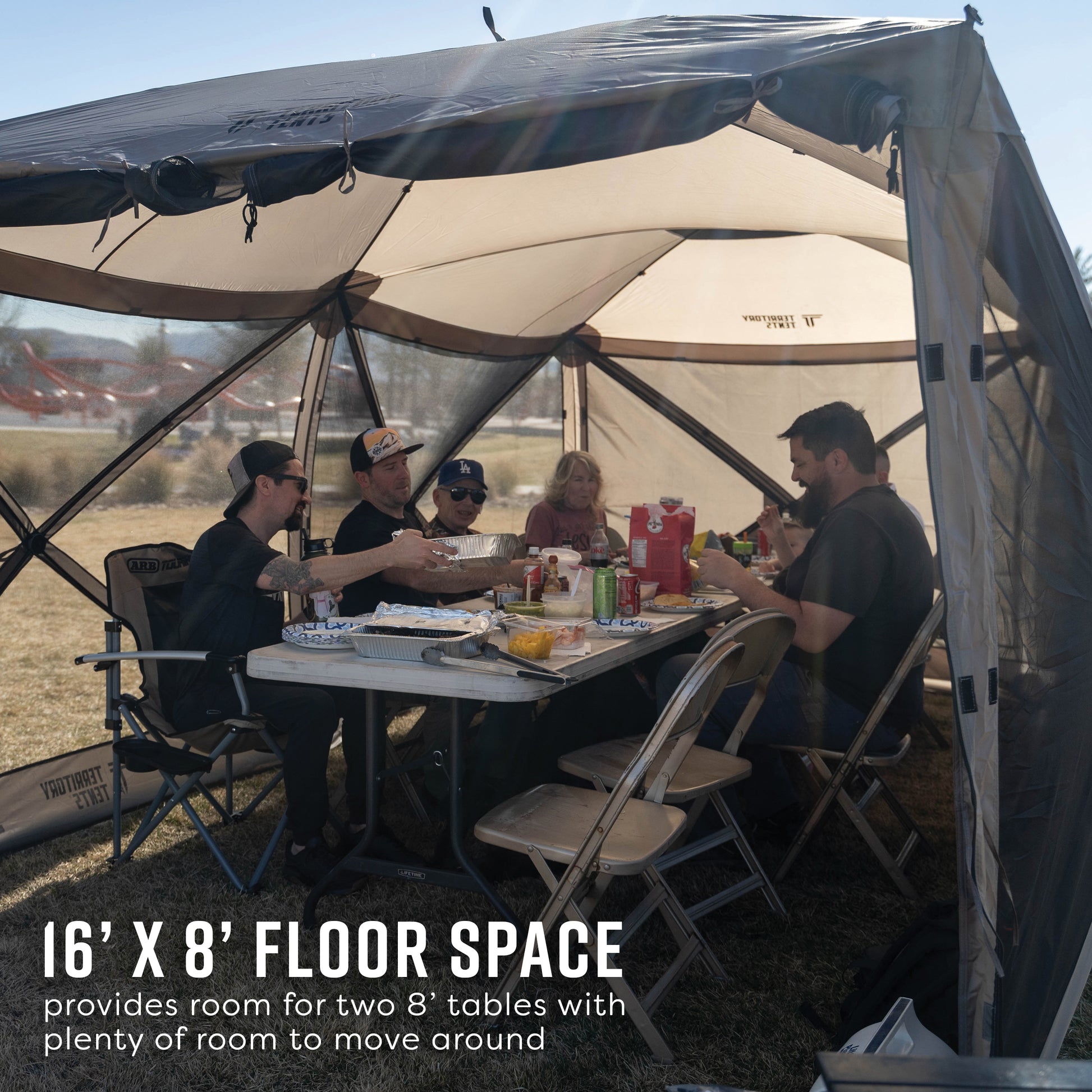 The Event Tent is 16’ long and 8’ wide providing room for two folding tables and chairs, it also stands 7’ tall so you can move around comfortably.